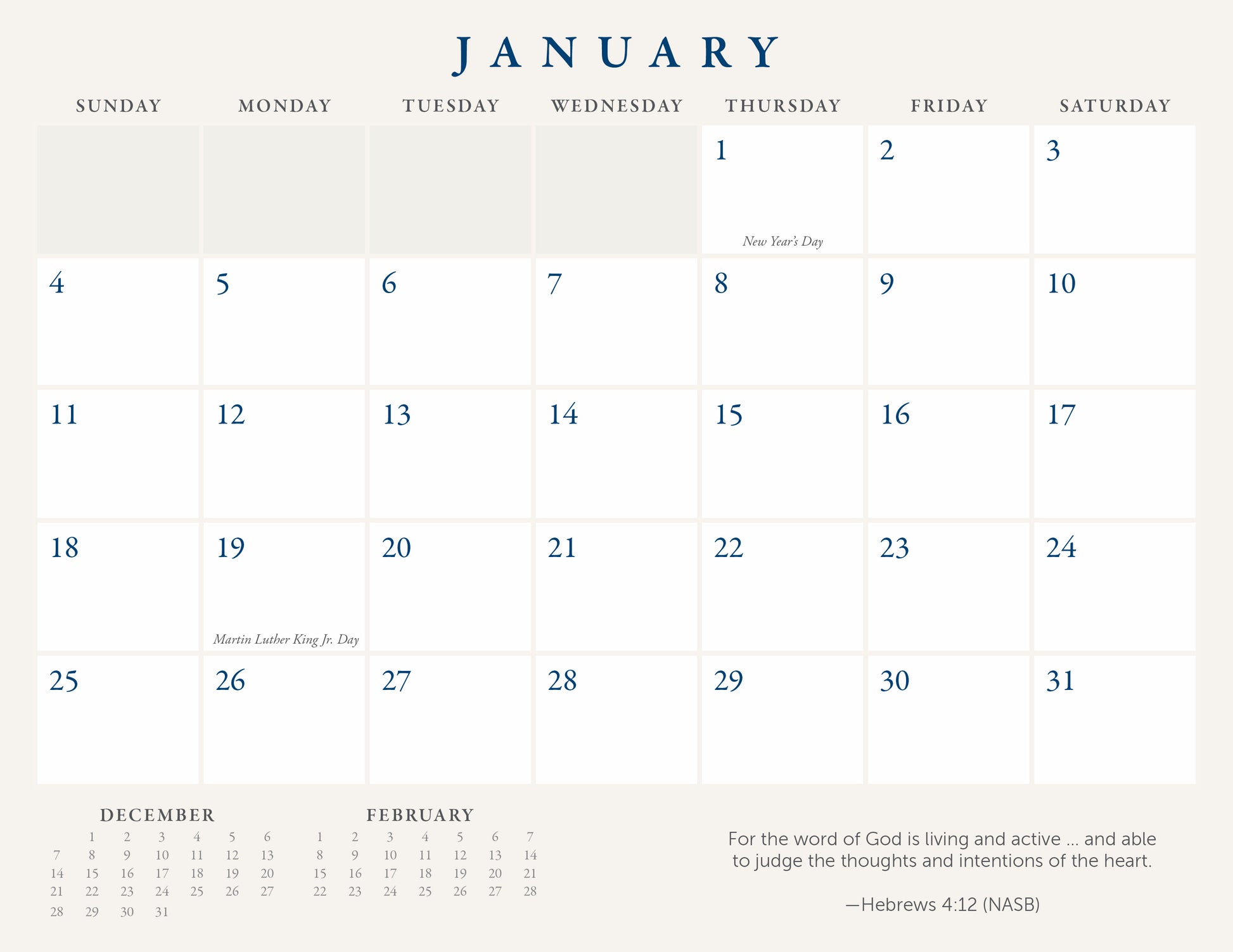 Along with the great photos, the calendar features a monthly verse and a year-at-a-glance calendar.