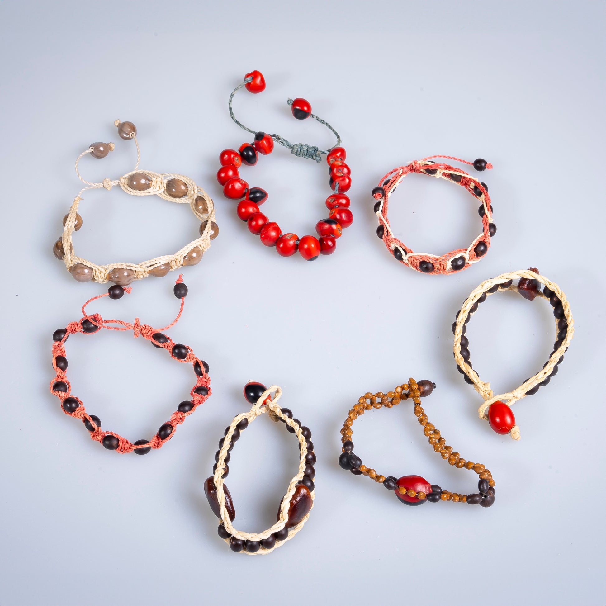 Bracelets made in Ecuador from palm leaf and various seeds. Colors and patterns vary.